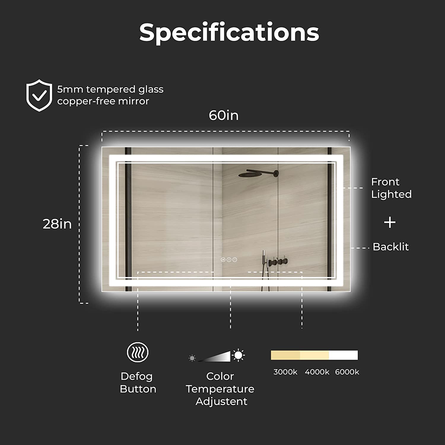 Awandee Home Backlit + Front Lighted Vanity Mirror for Bathroom 60 x 28 Inch