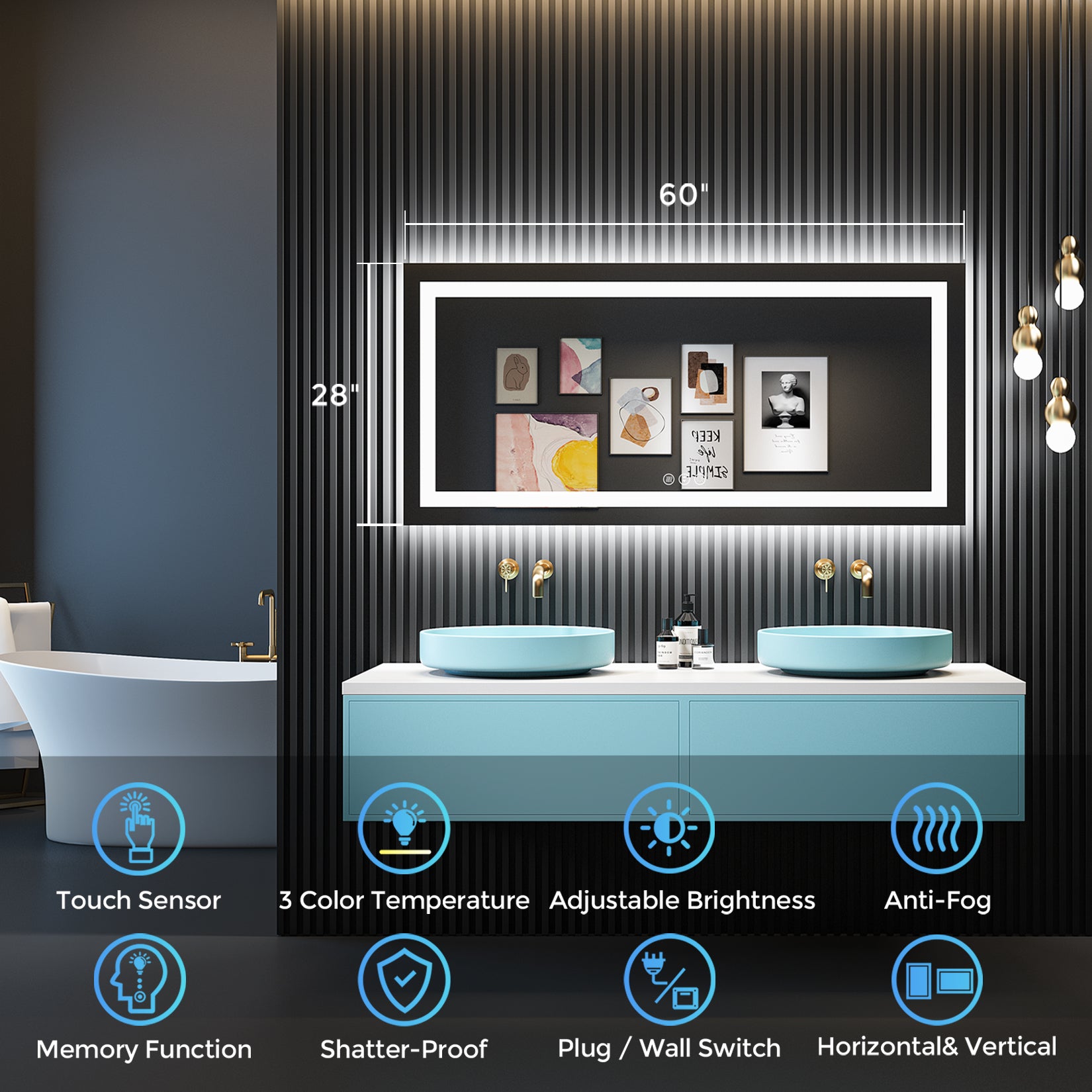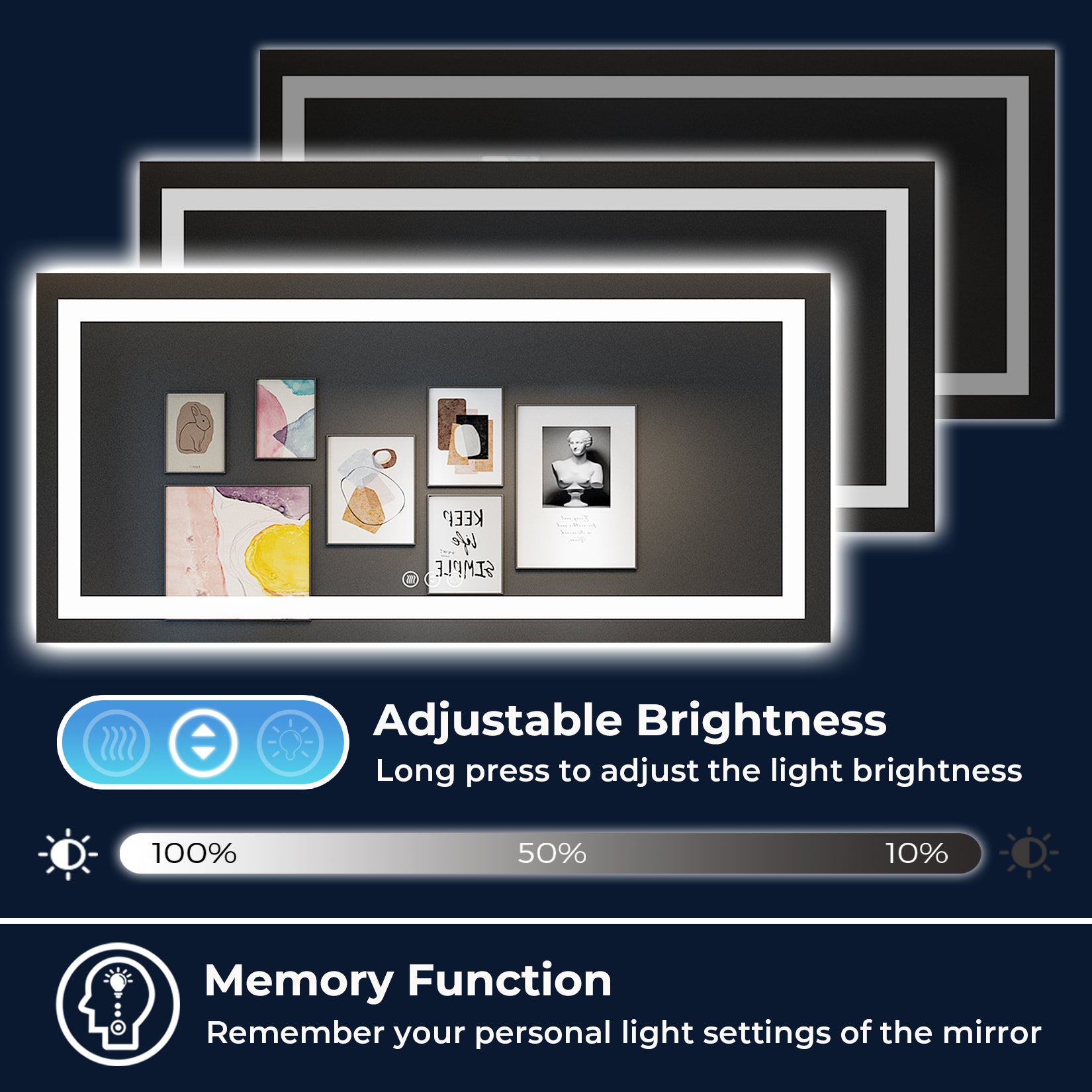 • 【3 Color Lights & Dimmable & Memory Function】- This lighted bathroom mirror is dimmable and has 3 color lights, you can switch between warm light (3000K), neutral light (4000K) and white light (6000K) by touching the light button. Long press the brightness button to adjust the brightness (10%~100%). This smart bathroom mirror with lights also features a memory function, which will record the lighting settings and maintain the previous lighting state after being turned off and on