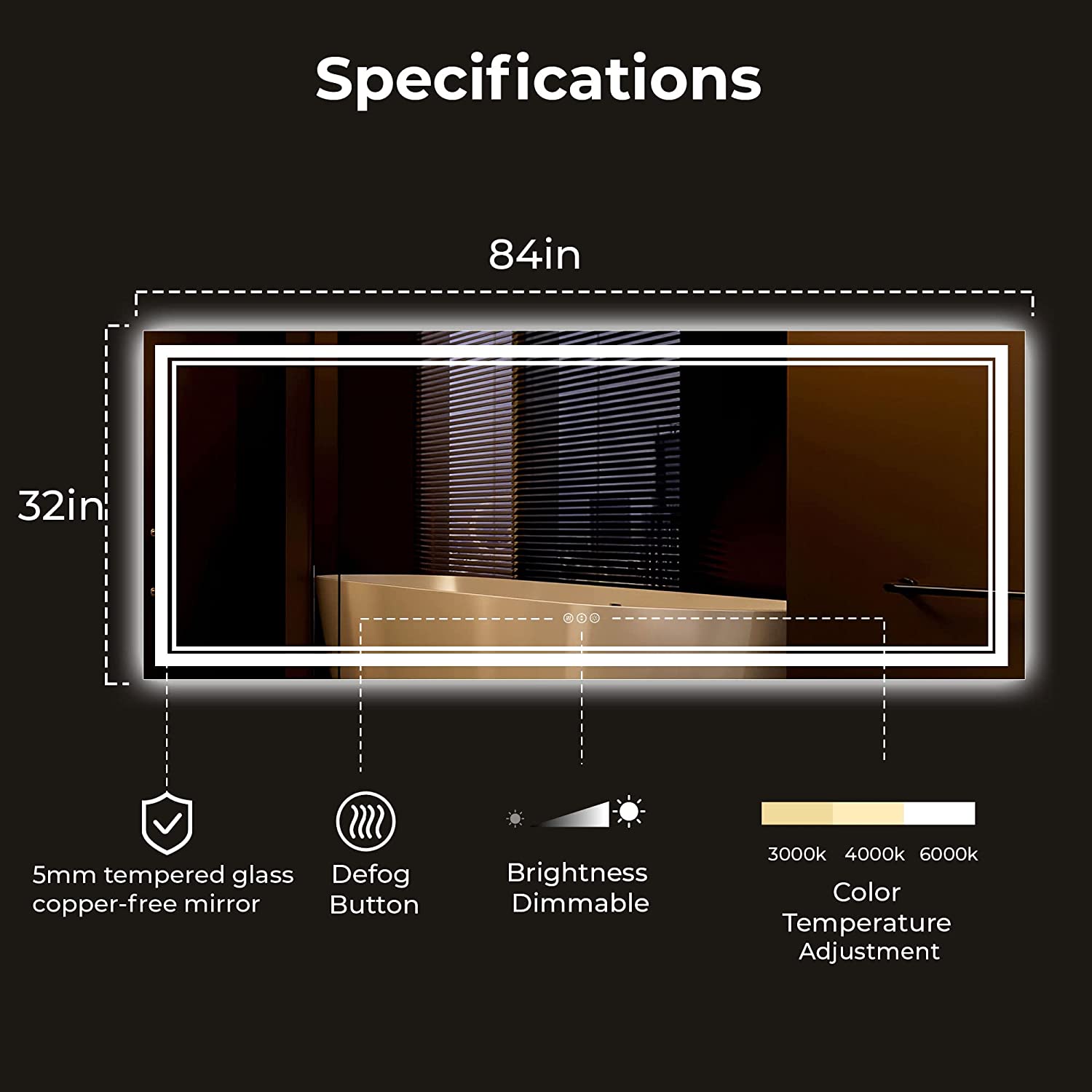 Awandee Home Backlit + Front Lighted Vanity Mirror for Bathroom 84 x 32 Inch