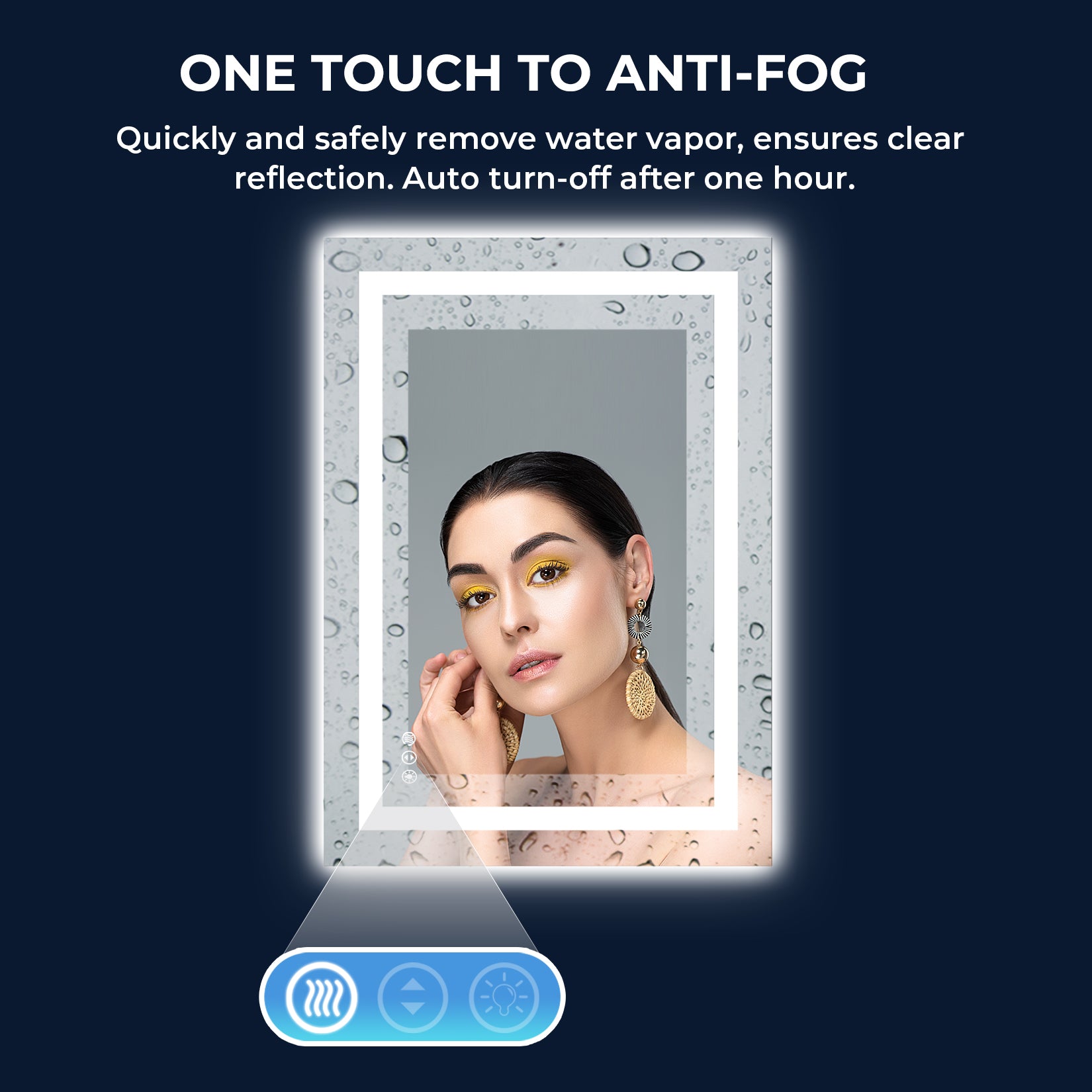 【3 Color Lights & Dimmable & Memory Function】- This lighted bathroom mirror is dimmable and has 3 color lights, you can switch between warm light (3000K), neutral light (4000K) and white light (6000K) by touching the light button. Long press the brightness button to adjust the brightness (10%~100%). This smart bathroom mirror with lights also features a memory function, which will record the lighting settings and maintain the previous lighting state after being turned off and on